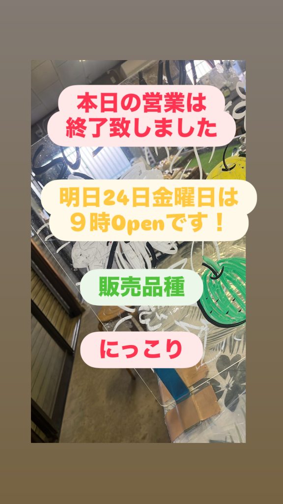 本日の営業は終了致しました!明日23日木曜日の販売は9時Open