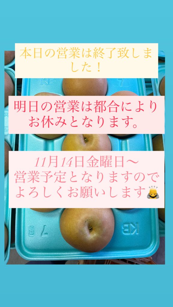 本日の営業は終了致しました!明日11月2日日曜は直売所お休みです!