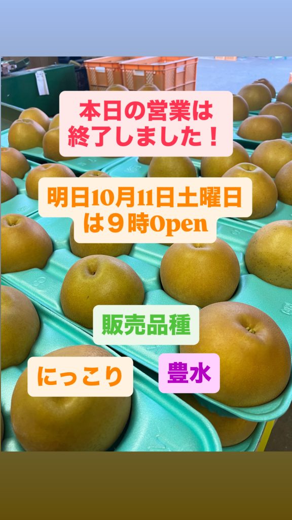本日直売所、都合により予定より早く閉めてしまいました。明日も梨販売の予定となっております。